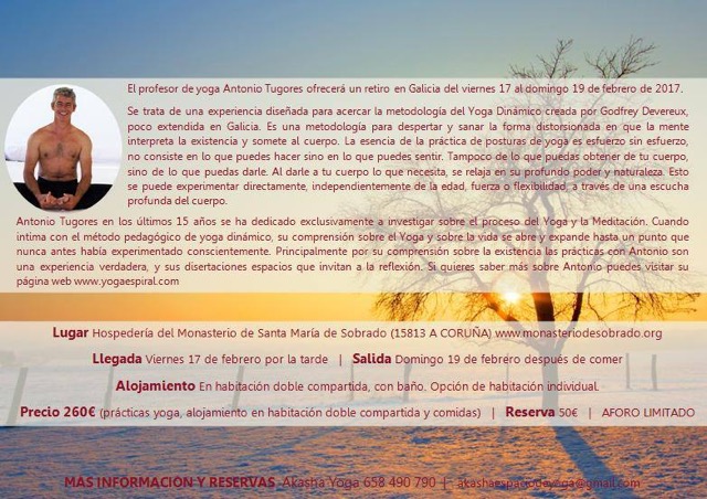 Se trata de una experiencia diseñada para acercar la metodología del Yoga Dinámico creada por Godfrey Devereux, poco extendida en Galicia. Es una metodología para despertar y sanar la forma distorsionada en que la mente interpreta la existencia y somete al cuerpo.